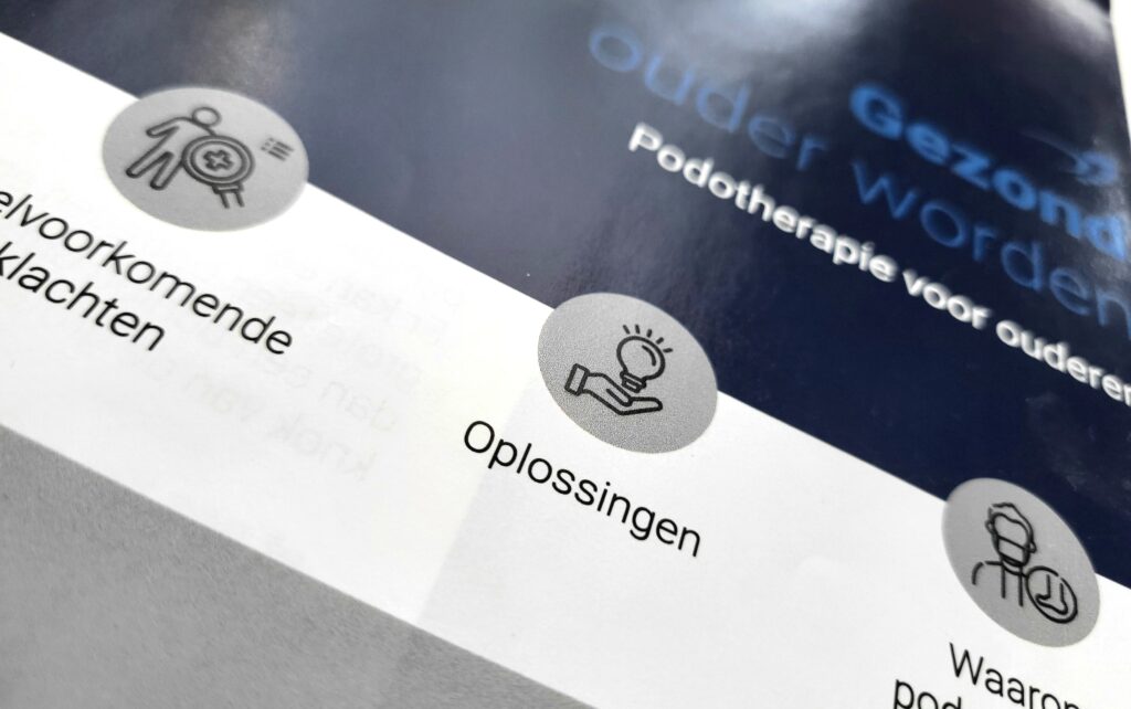 De folder is ingezet als promotioneel communicatiemiddel tijdens een kleine zorgbeurs/conferentie. In zo’n omgeving is het belangrijk dat informatie snel te scannen is en tegelijk vertrouwen uitstraalt. Daarom heb ik gekozen voor een rustige, professionele vormgeving met duidelijke koppen, korte tekstblokken en een logische opbouw. De onderwerpen sluiten aan bij veelvoorkomende klachten bij ouderen, zoals artrose, verminderde schokdemping en standsafwijkingen van de tenen, waardoor bezoekers zichzelf gemakkelijk herkennen in de inhoud.